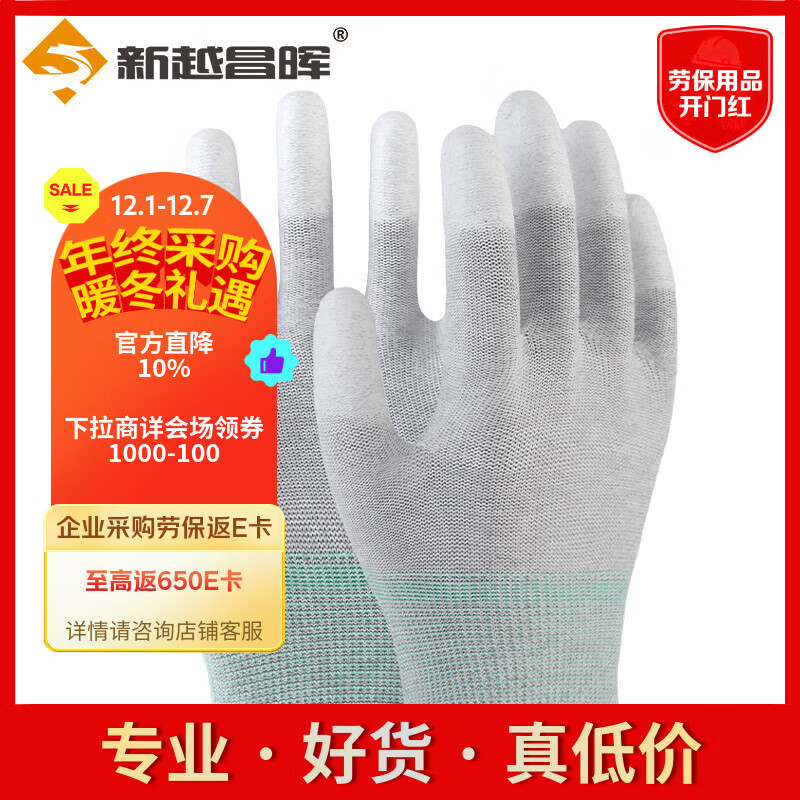 新越昌晖PU尼龙涂指劳保手套 12副/包 碳纤维涂胶防滑透气工作防护手套M码