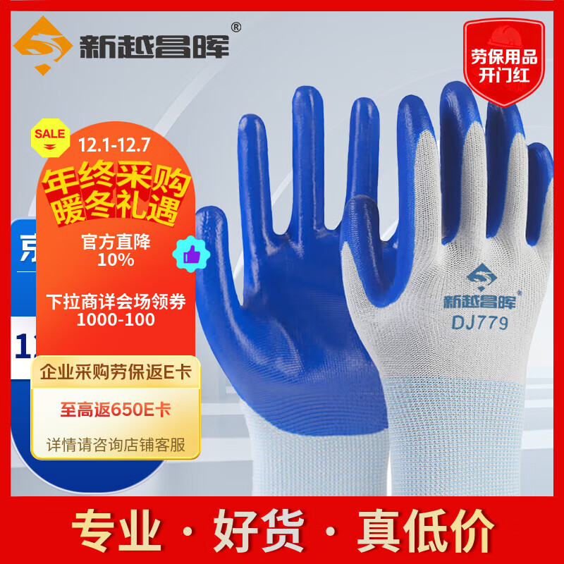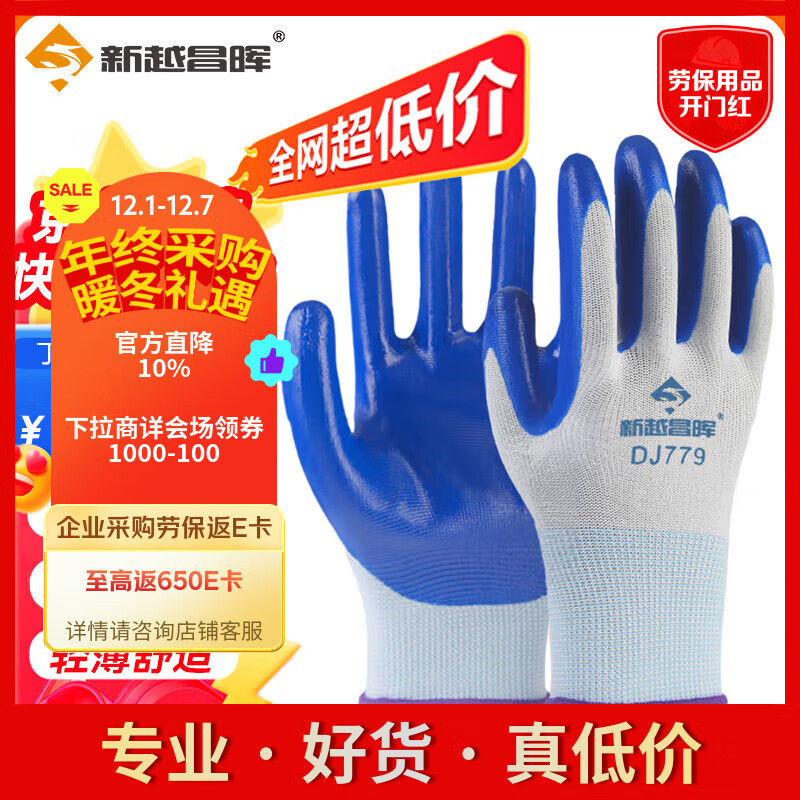 新越昌晖 手套劳保丁腈浸胶手套 防滑耐磨涂掌手套加厚工作防护男女12双/包B11440正品行货