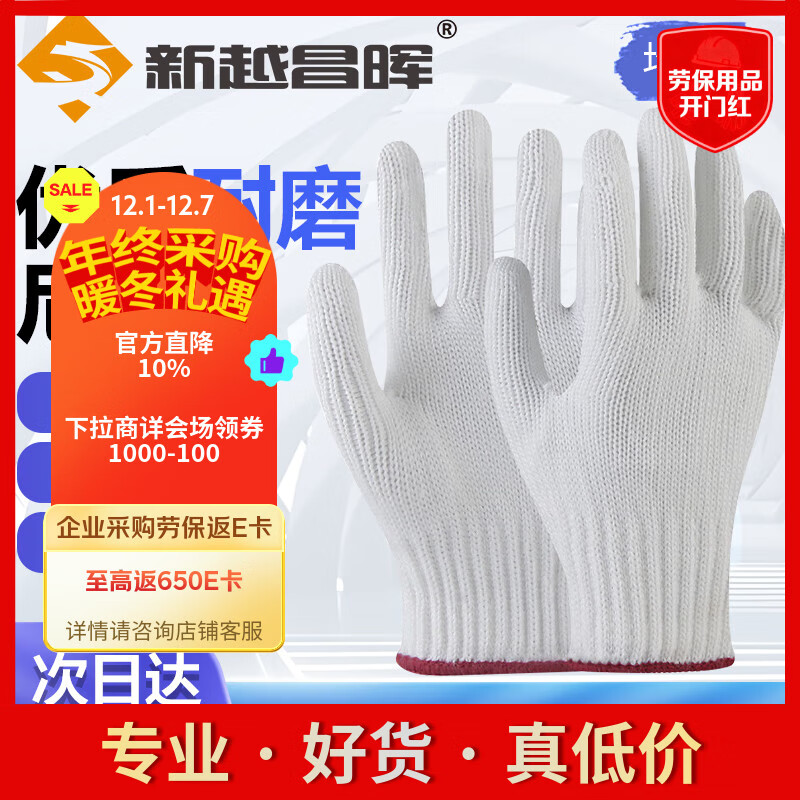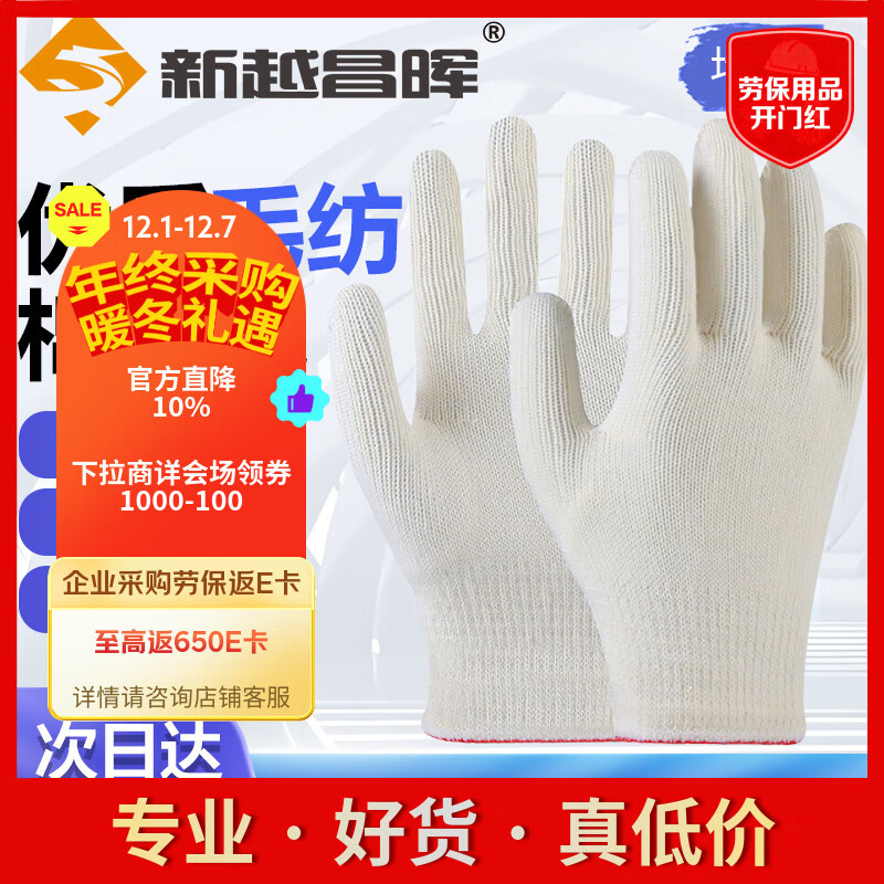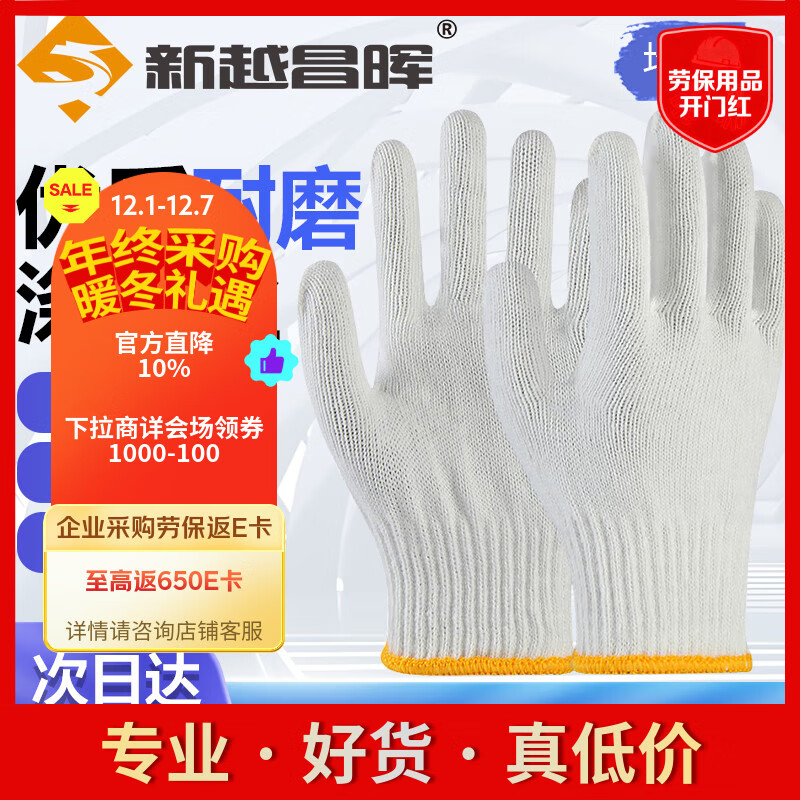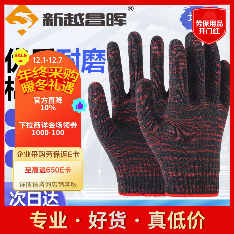 新越昌晖 棉纱线手套 12双/包 加厚防滑耐磨劳保手套 手工10针 优质涤纶 均码B11410【正品行货】