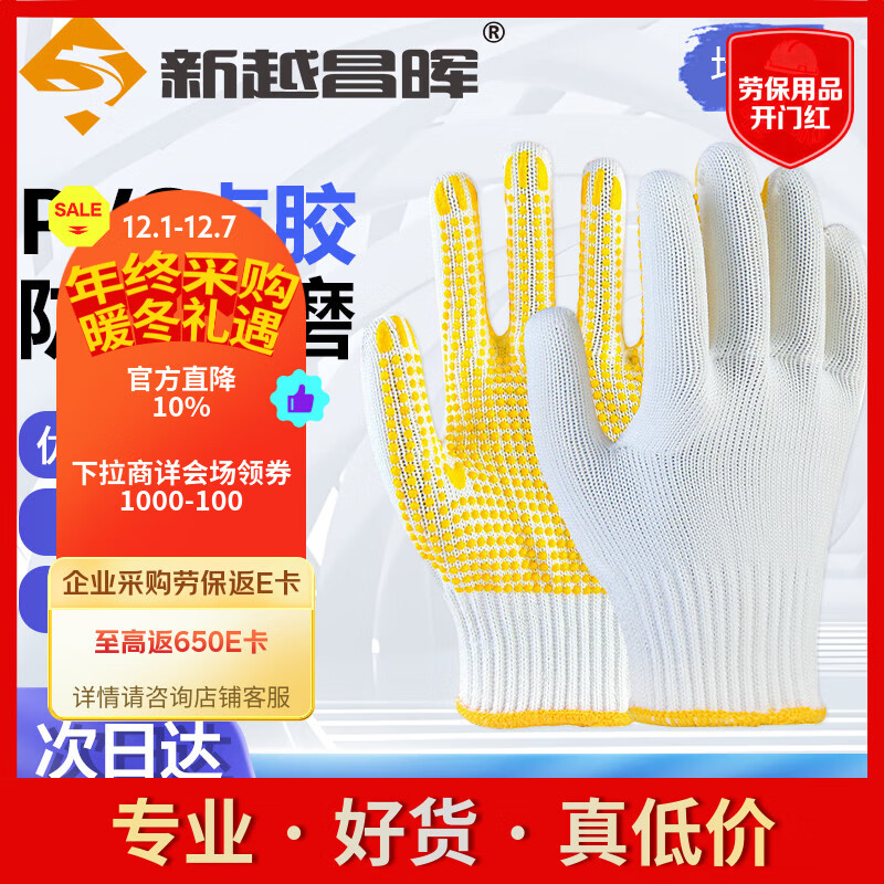 新越昌晖 点塑劳保手套 点胶棉线手套 12双/包 黄色 加厚防滑耐磨 户外施工搬家搬运 均码【正品行货】