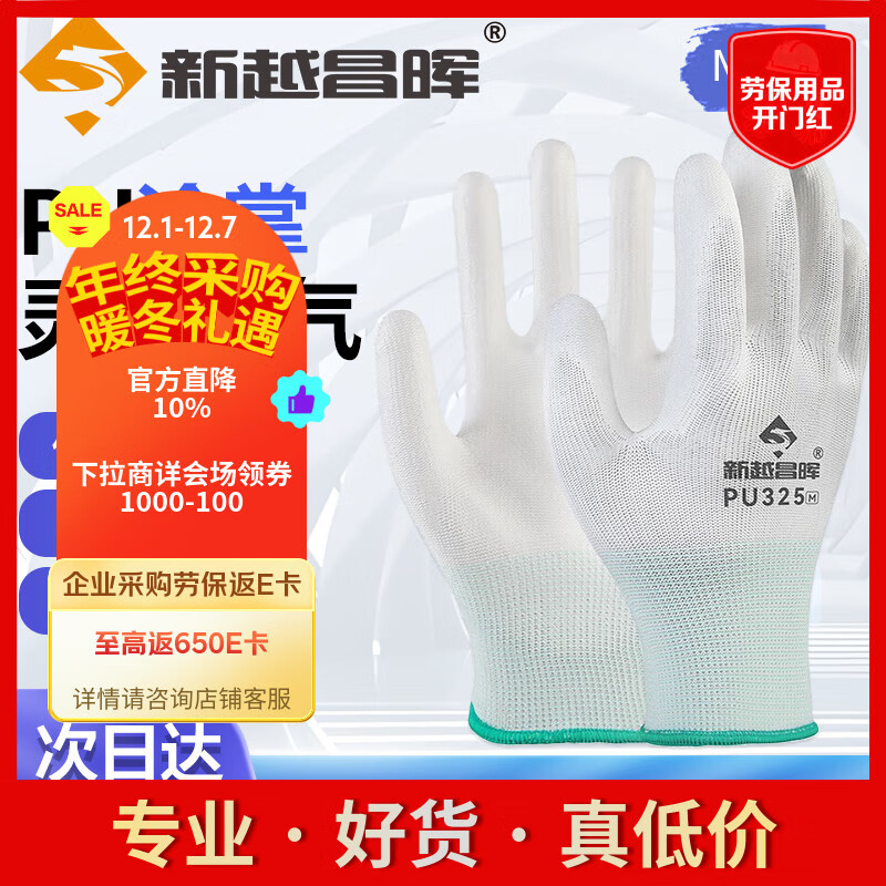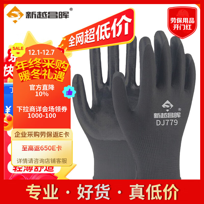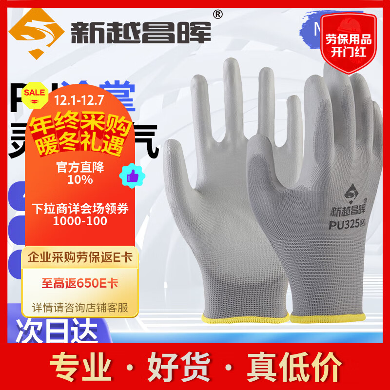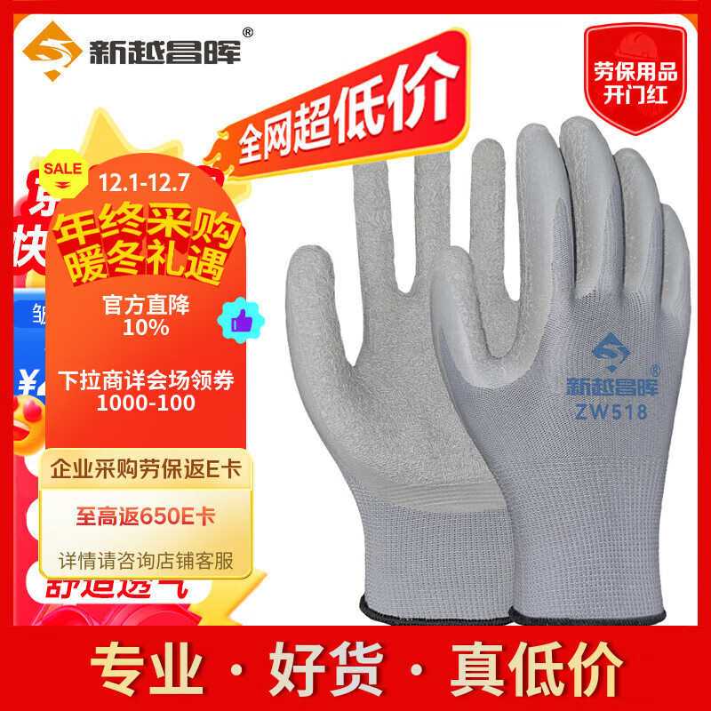 新越昌晖PU涂掌手套 12双/包 劳保手套 尼龙浸胶耐磨防滑工作防护手套B11429