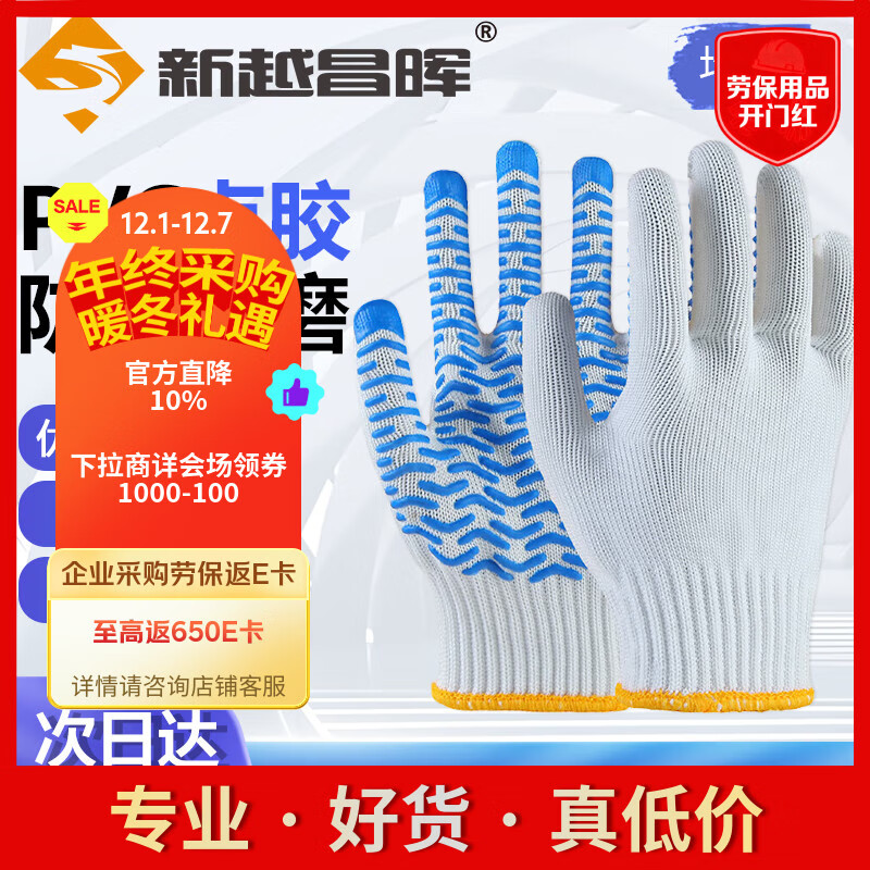 新越昌晖 点塑点胶手套 12双/包 劳保手套 防滑耐磨加厚棉线手套B11407