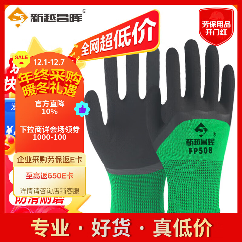 新越昌晖 丁腈手套劳保浸胶防滑耐磨涂掌手套工作防护男女12双/包B11423正品行货