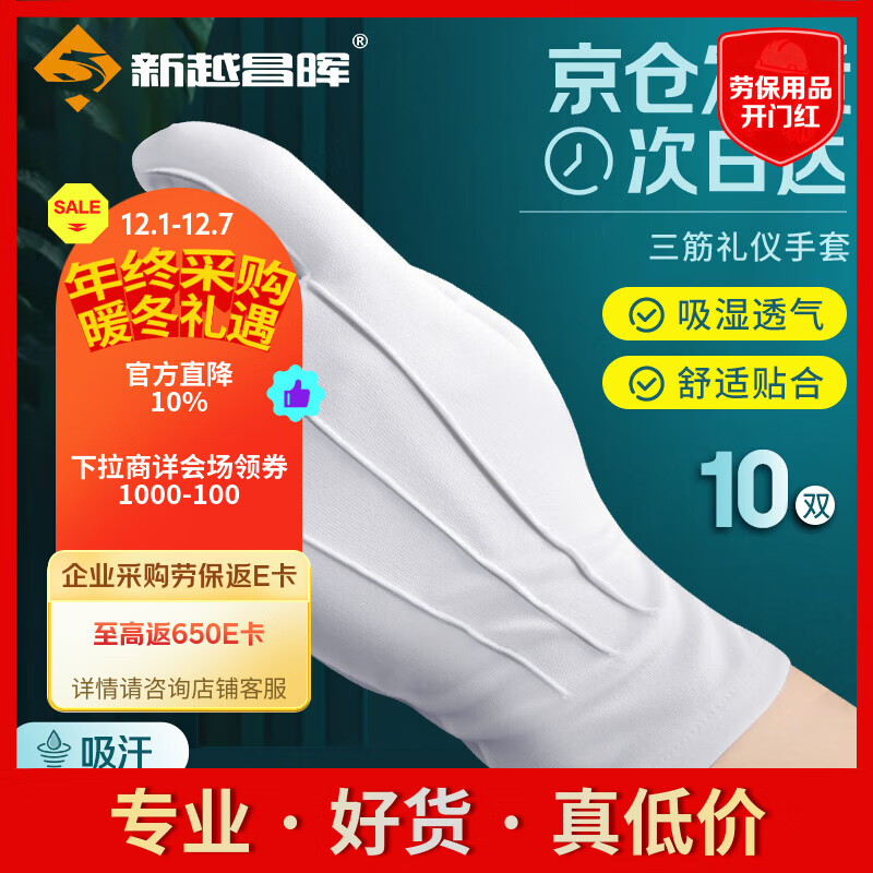 新越昌晖 礼仪手套 10副装白手套 文玩手套 涤纶 马术/检阅/表演手套劳保 L码 F31009