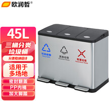 欧润哲 45L三桶分类不锈钢垃圾桶 带盖大号室内户外干湿分离脚踏式设计商用公司大厅物业餐厅三分类脚踏方桶垃圾卫生桶