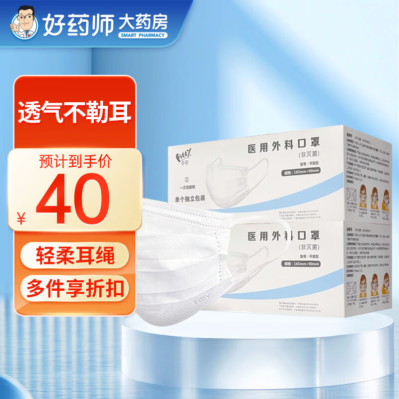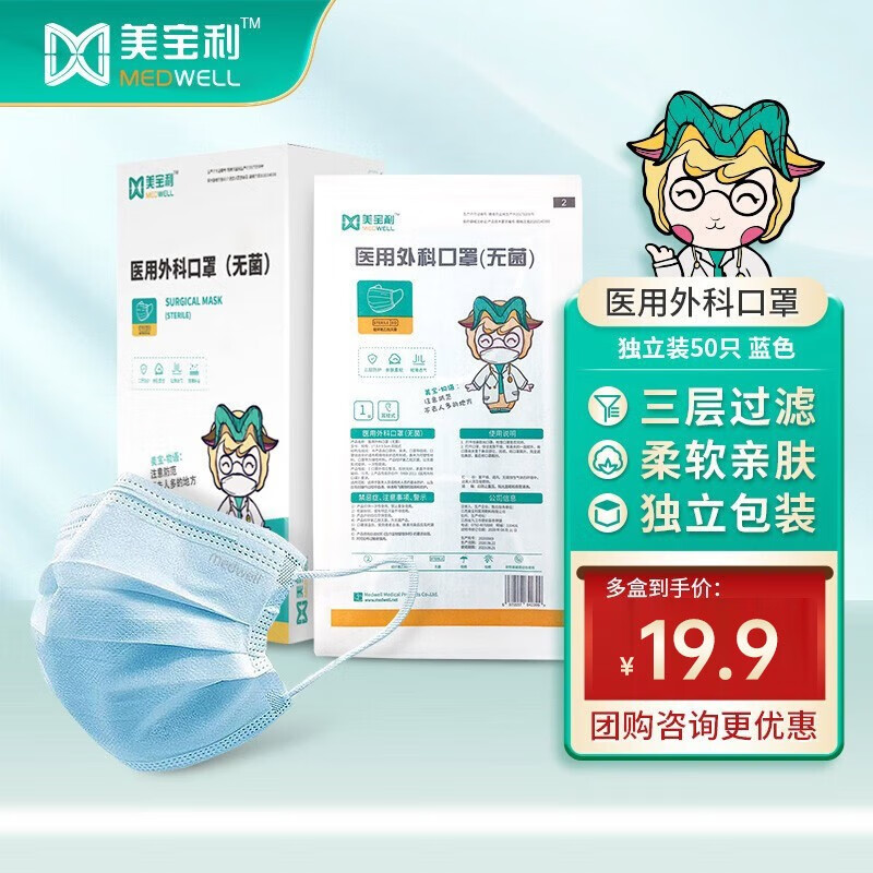 美宝利口罩一次性医用外科口罩医用医疗无菌灭菌含熔喷布耳戴式隔离飞沫学生成人医用口罩 【推荐】【独立装蓝色50只】医用外科口罩-灭菌级