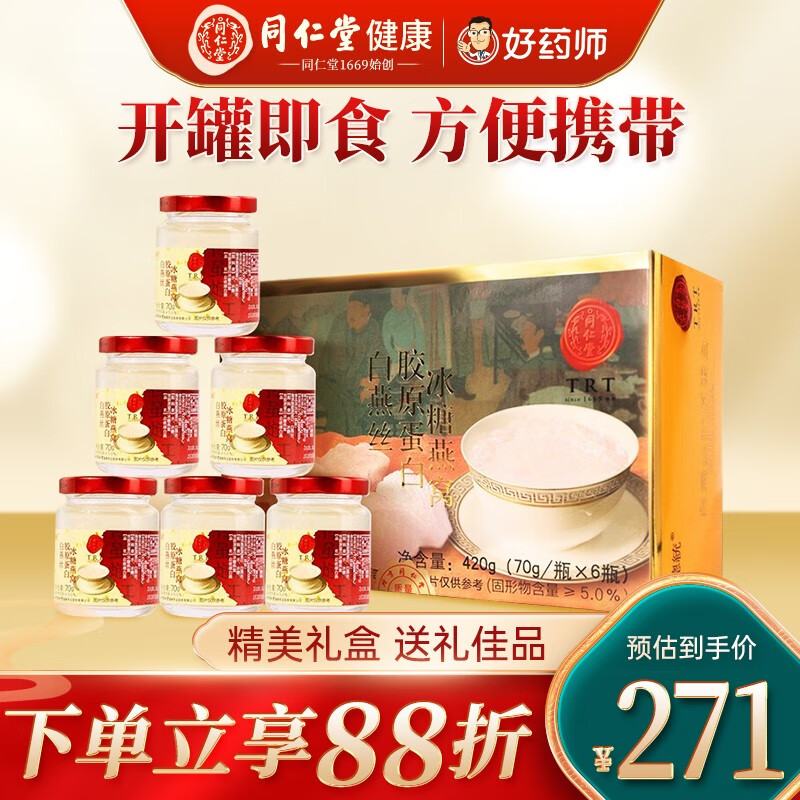 北京同仁堂即食燕窝白燕丝胶原蛋白冰糖燕窝70g*6瓶礼盒装送礼品袋燕窝即食孕妇产后补品老人怀孕补品