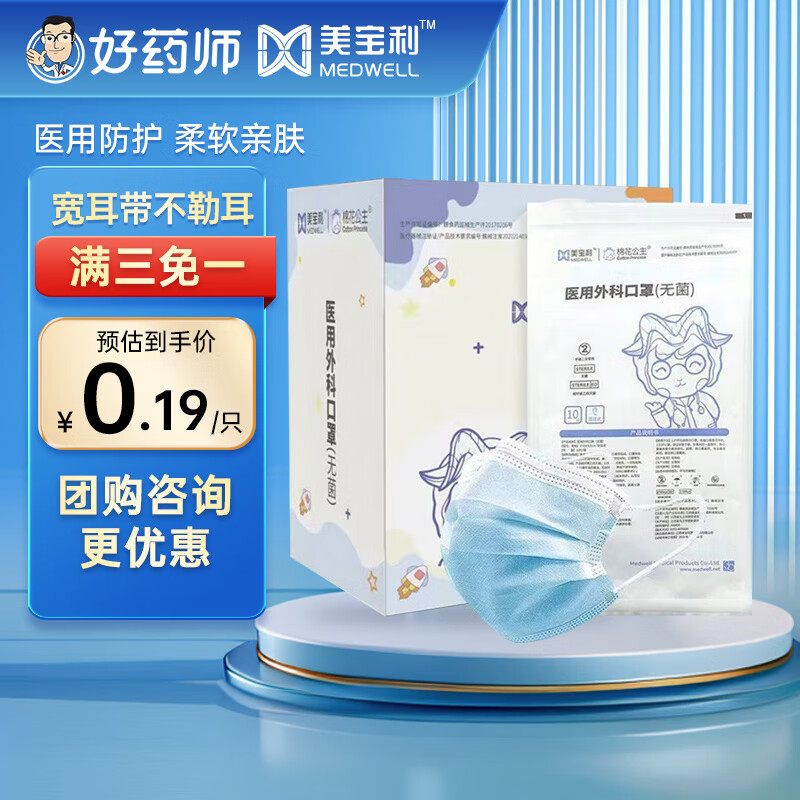 美宝利口罩一次性医用外科口罩医用医疗无菌灭菌含熔喷布宽耳戴式不勒耳隔离飞沫学生成人医用口罩 【蓝色】医用外科口罩-灭菌级-50只