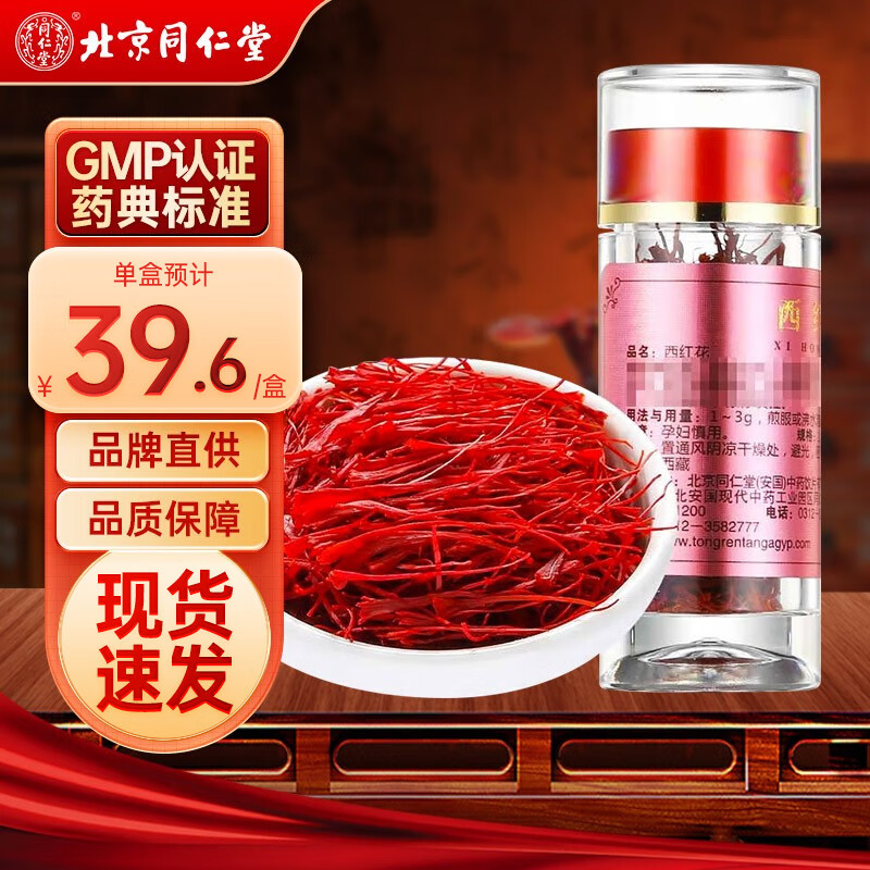 北京同仁堂藏红花茶中药材西红花番红花全长红丝泡水喝解郁安神活血化瘀 1g/瓶