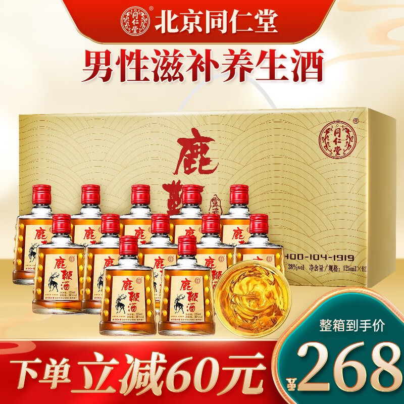 药房发货】北京同仁堂鹿鞭酒38度露酒男性 补酒含益智仁桑葚枸杞子玉竹山药花椒百合 125ml*12瓶【一整箱】