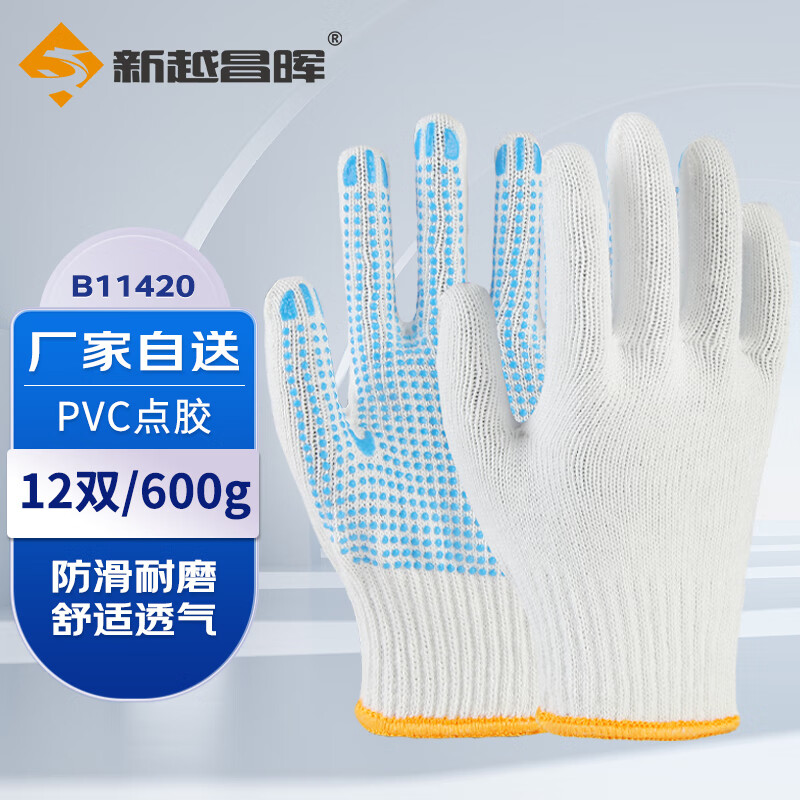 新越昌晖点塑手套 劳保手套 防滑耐磨透气棉线手套 工地工作防护手套 店长推荐B11420 纱线款蓝点珠 12副/均码