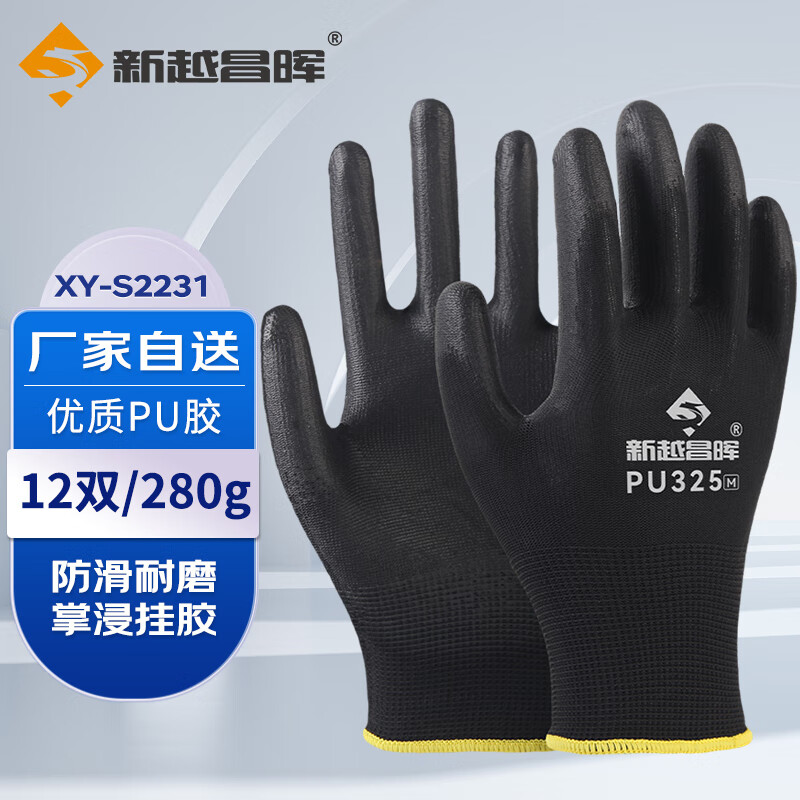 新越昌晖PU尼龙涂掌手套 涂胶涂层劳保手套 防护手套 耐磨防滑透气男女工地工作干活线手套 PU尼龙涂掌黑 12副/M码 XY-S2231