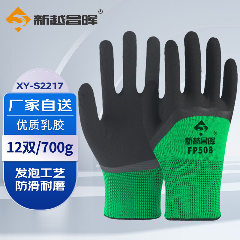 新越昌晖乳胶发泡手套劳保皱纹手套 浸胶挂胶防滑耐磨涂胶胶皮工地工作防护手套 乳胶发泡绿黑12副/均码 XY-S2217