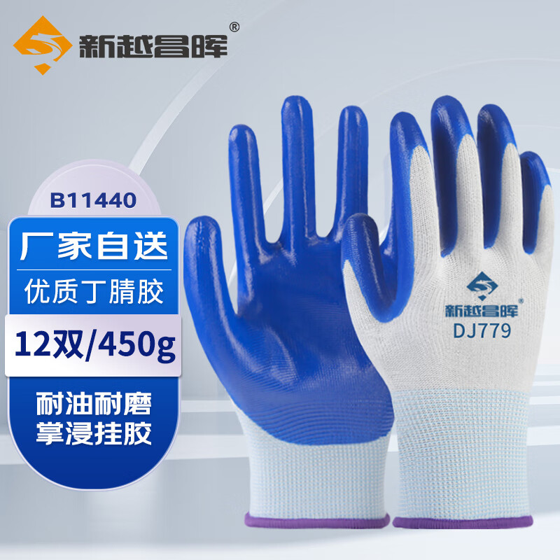 新越昌晖尼龙丁腈手套 劳保手套 涂胶浸胶乳胶手套 耐磨防滑透气工地工作男女防护手套 42g/副 蓝色丁腈12副