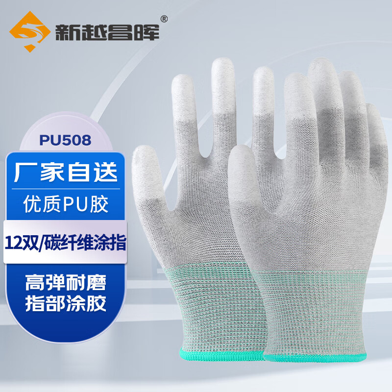 新越昌晖PU尼龙涂掌手套 涂胶涂层劳保手套 防护手套 耐磨防滑透气男女工地工作干活线手套 PU涂指(碳纤维)12副装/M码 PU518