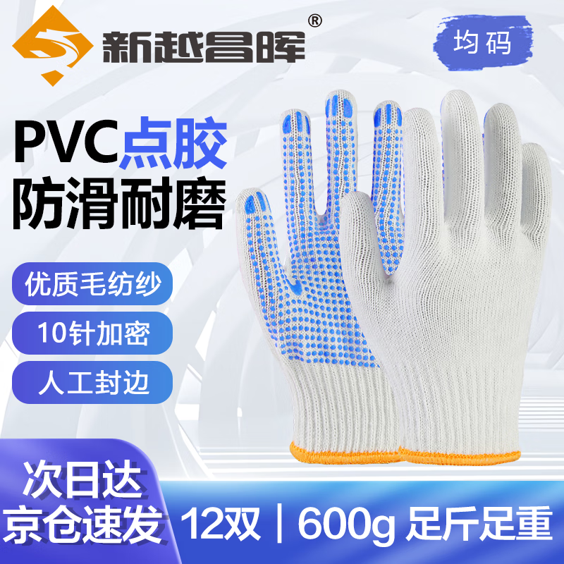 新越昌晖 劳保手套 点塑点胶手套防滑耐磨棉线手套点珠防护男女12双/包B11420正品行货