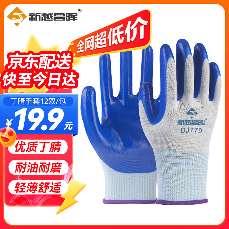 新越昌晖 手套劳保丁腈浸胶手套 防滑耐磨涂掌手套加厚工作防护男女12双/包B11440正品行货