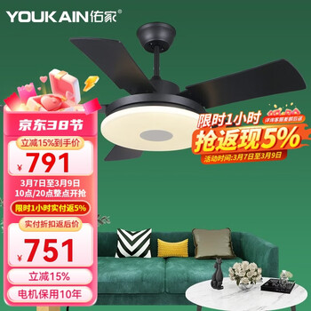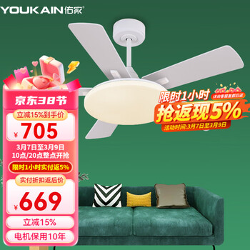 佑家LED餐厅风扇灯吊扇灯现代简约客厅吊灯风扇卧室电扇灯 哑光白 配壁控(两火一零) 48寸