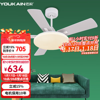 佑家LED餐厅风扇灯吊扇灯现代简约客厅吊灯风扇卧室电扇灯 哑光白 配壁控(两火一零) 48寸