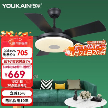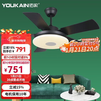 佑家LED餐厅风扇灯吊扇灯现代简约客厅吊灯风扇卧室电扇灯 哑光白 配壁控(两火一零) 48寸